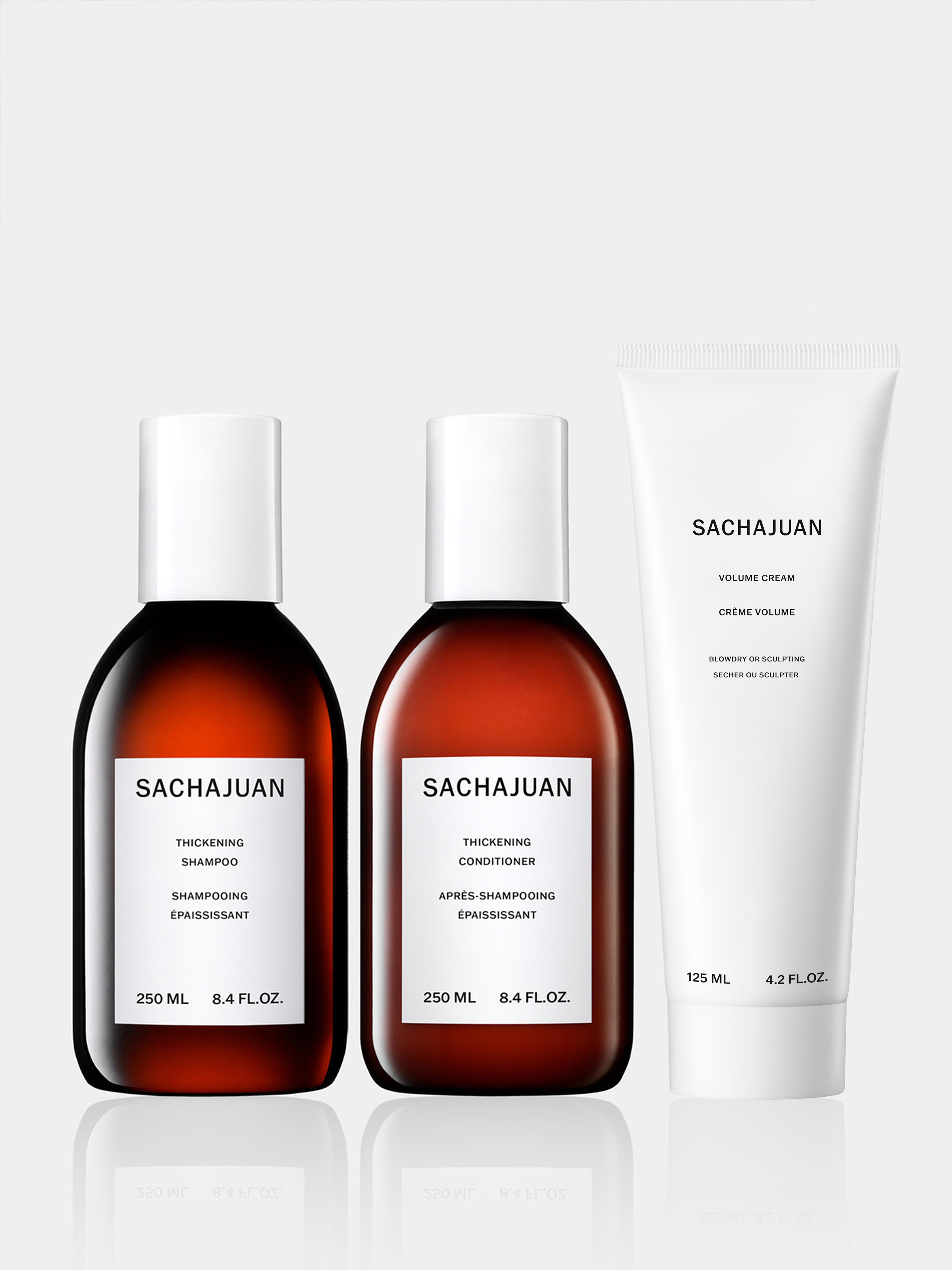 A complete routine designed to add volume, fullness, and shine while protecting hair from damage. Includes Thickening Shampoo, Thickening Conditioner, and Volume Cream.